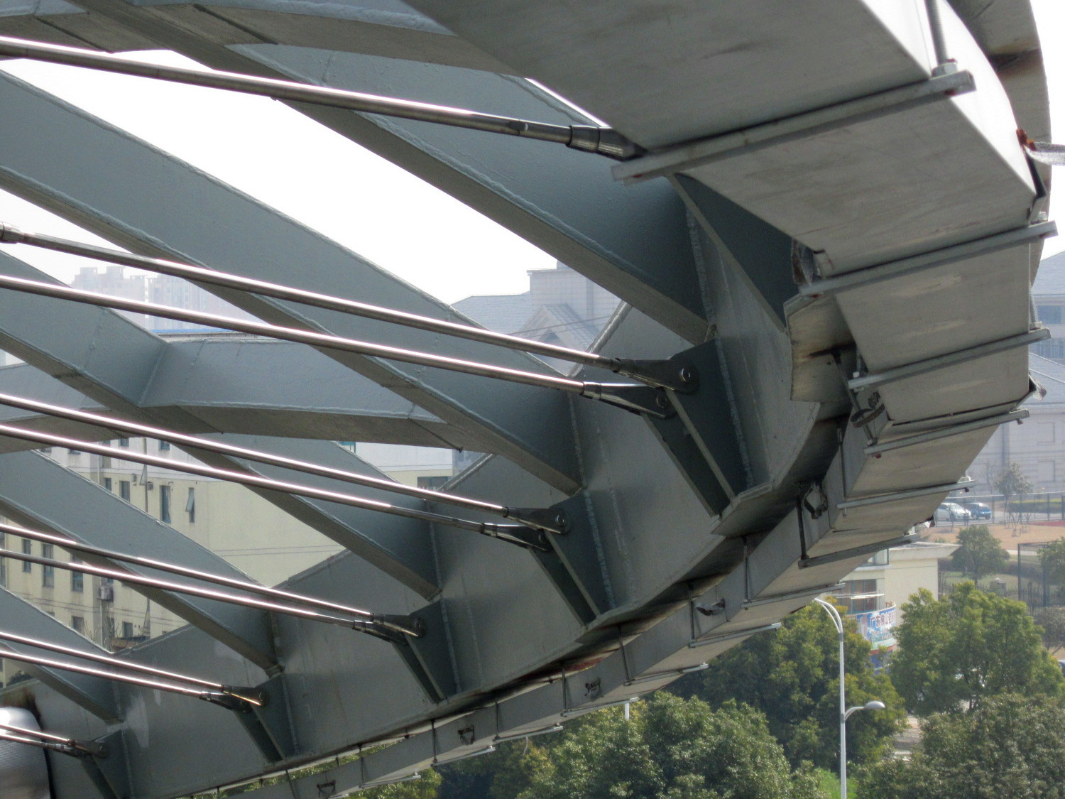 @外景圖 ![]() @拉桿中部節點 ![]() @活動屋蓋張拉完成仰視圖 ![]() @拉桿端部節點 ![]() @拉桿端部節點 本項目為空間不規則預應力鋼結構,拉桿分批張拉 ,采用臨時索對結構張拉預變形后安裝鋼拉桿 。張拉過程中拉桿間的相互作用較大,本公司對張拉過程進行了專項研究,詳見論文: