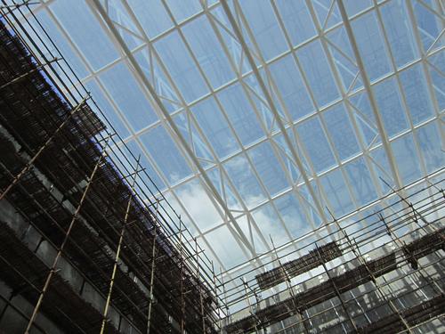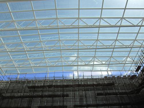 中庭采光頂結構形式為空間三角管桁架結構,跨度31.25米,本公司承擔該項目結構設計咨詢及采光頂的設計與施工。